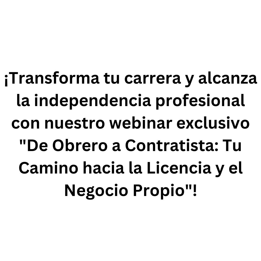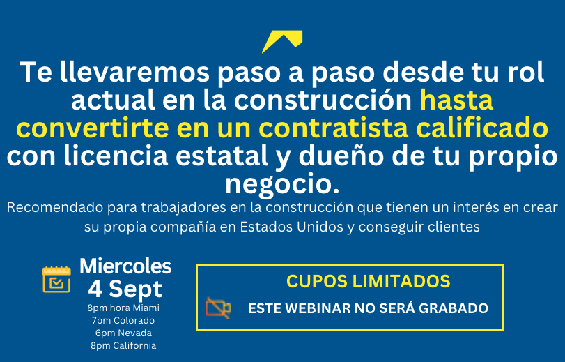 ¡Únete a nuestro webinar «De Obrero a Contratista» y aprende cómo obtener tu licencia y lanzar tu propio negocio exitoso en la construcción! ¡Inscríbete hoy y transforma tu carrera!